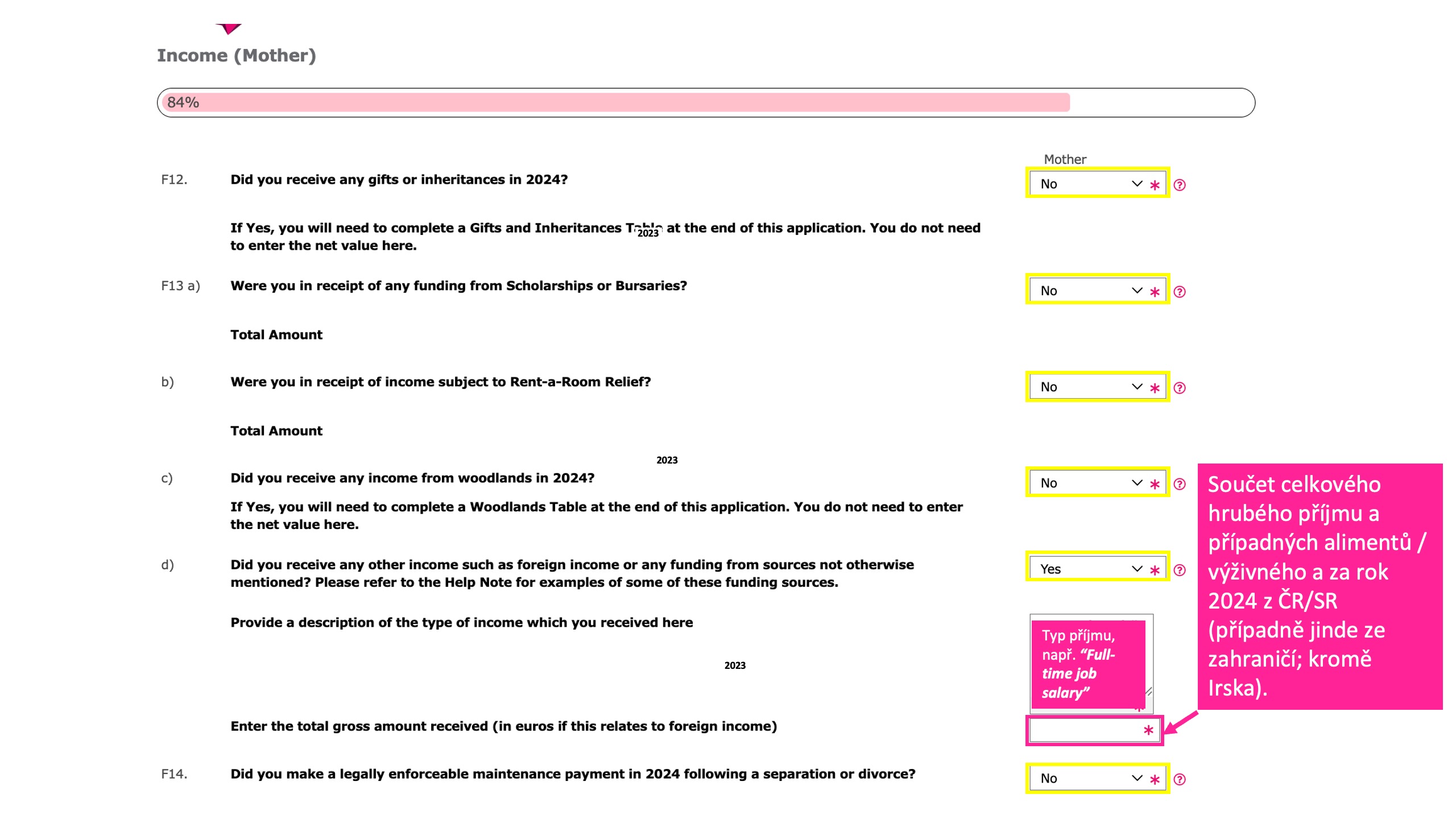 Jediná relevantní sekce pro EU studenty je F13 d). Všechny ostatní otázky vyplň jako „No“. Do této sekce vyplň částku v EUR, která je součtem: